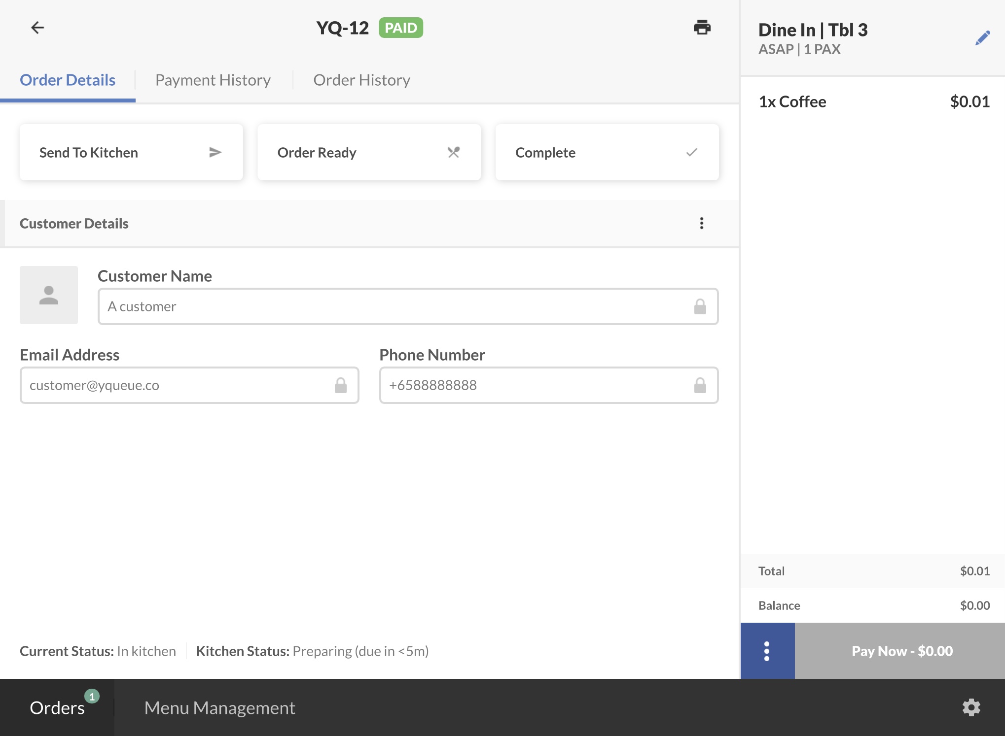 When a dine in order is placed it immediately becomes visible in the YQueue OMS dashboard.
