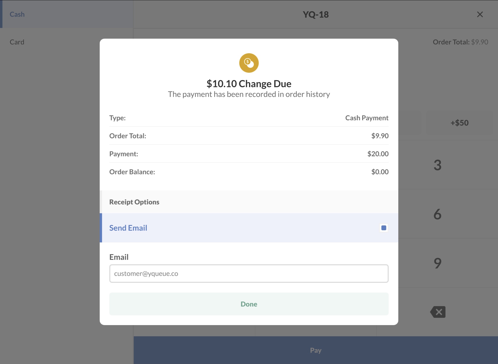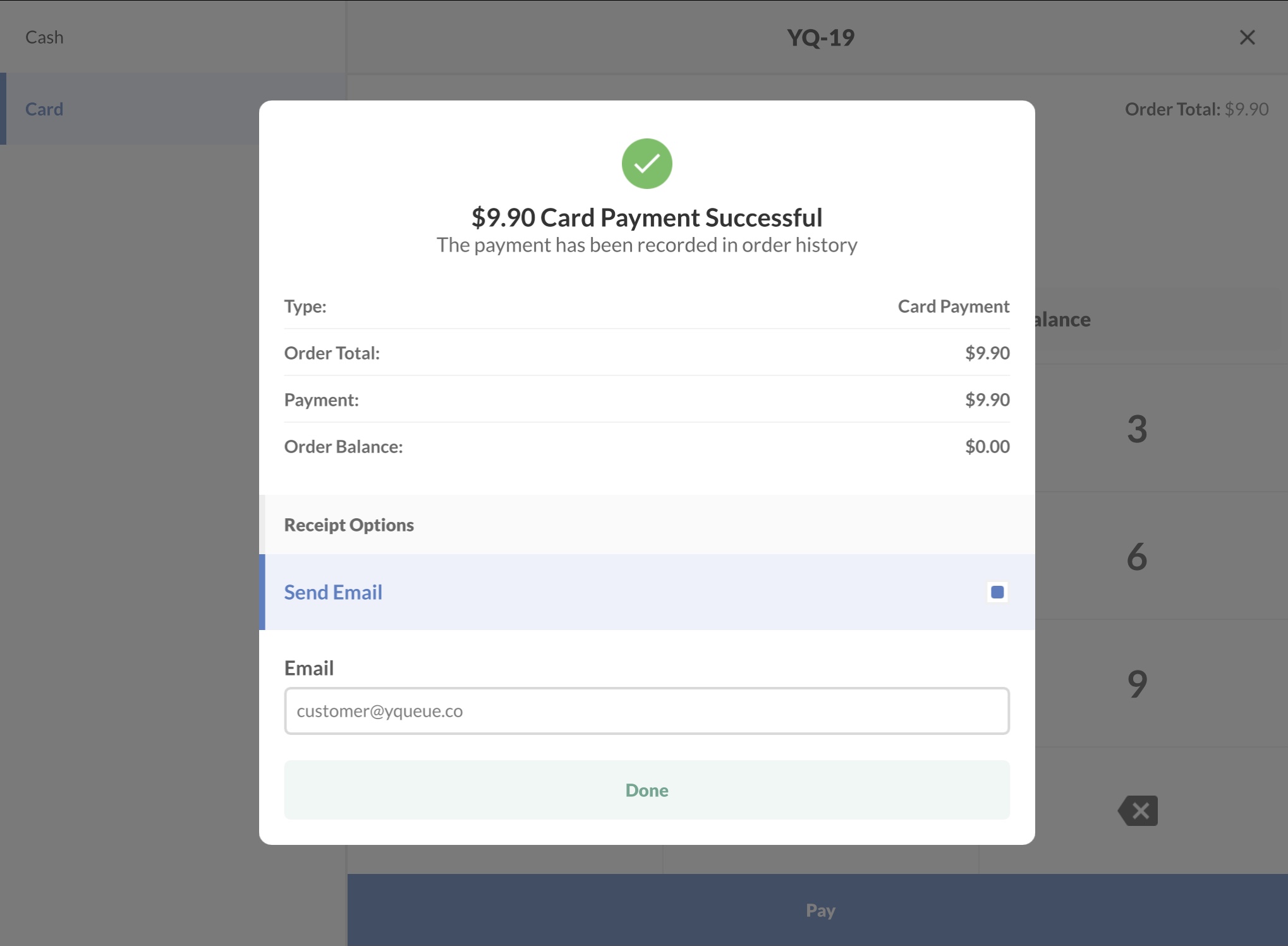 YQueue OMS has been designed to support common payment workflows out of the box, including cash and ad-hoc credit/debit card payments.
