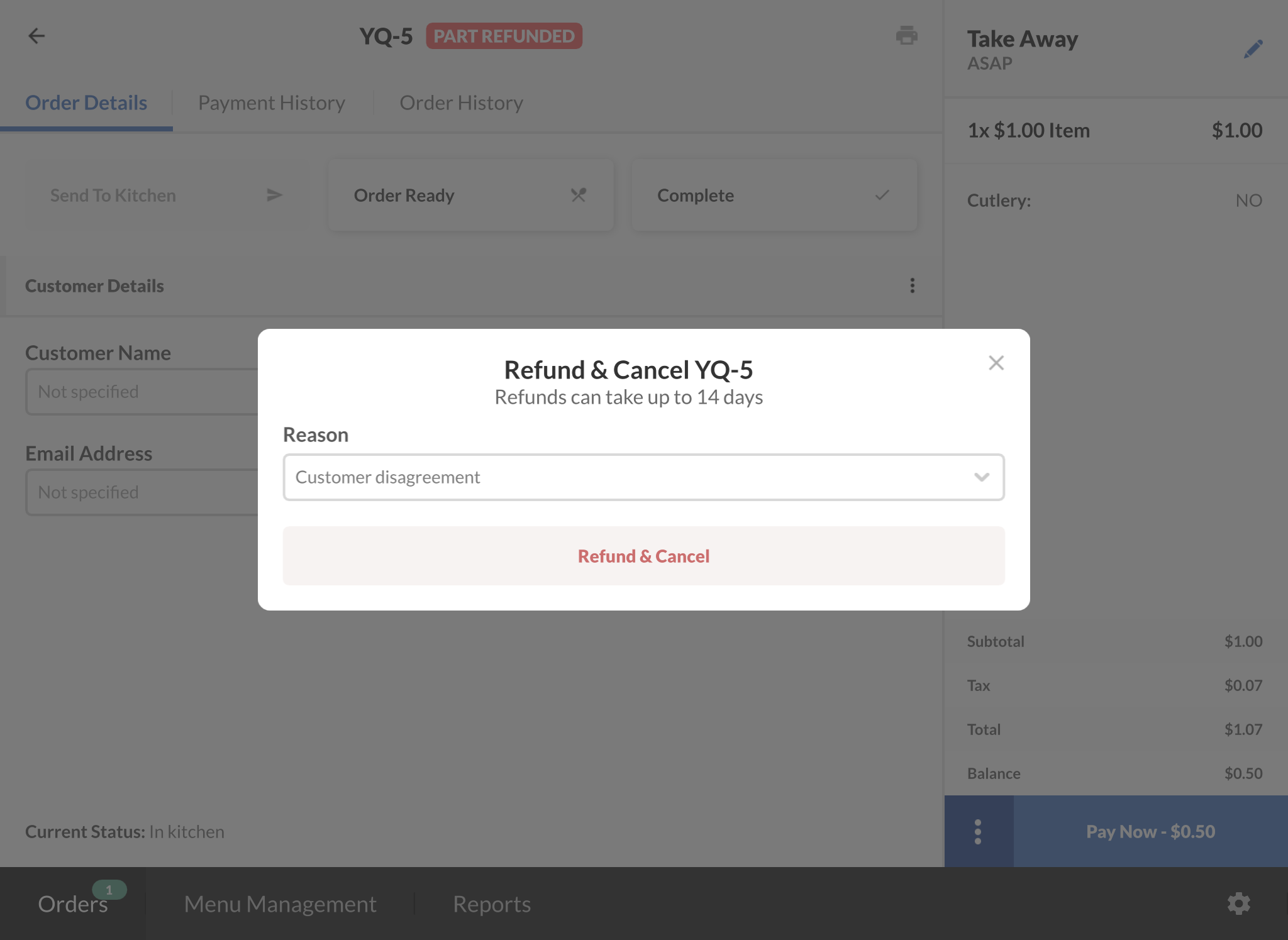 To refund the order tap the three dots next to the "Pay Now" button in the bottom right of the screen. From there, tap "Refund & Cancel Order".