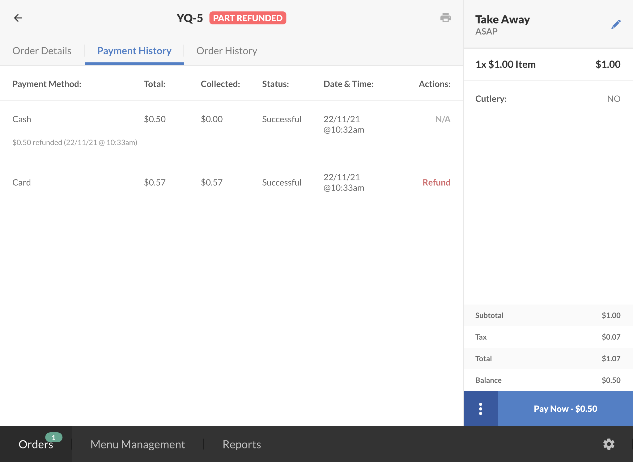 Partial refunds must be performed on a per-transaction basis (as YQueue OMS is unable to determine the most efficient refund method by itself). To perform a refund against a specific transaction, tap the "Payment History" tab when viewing an order and then tap the "Refund" action next to the transaction you wish to refund.