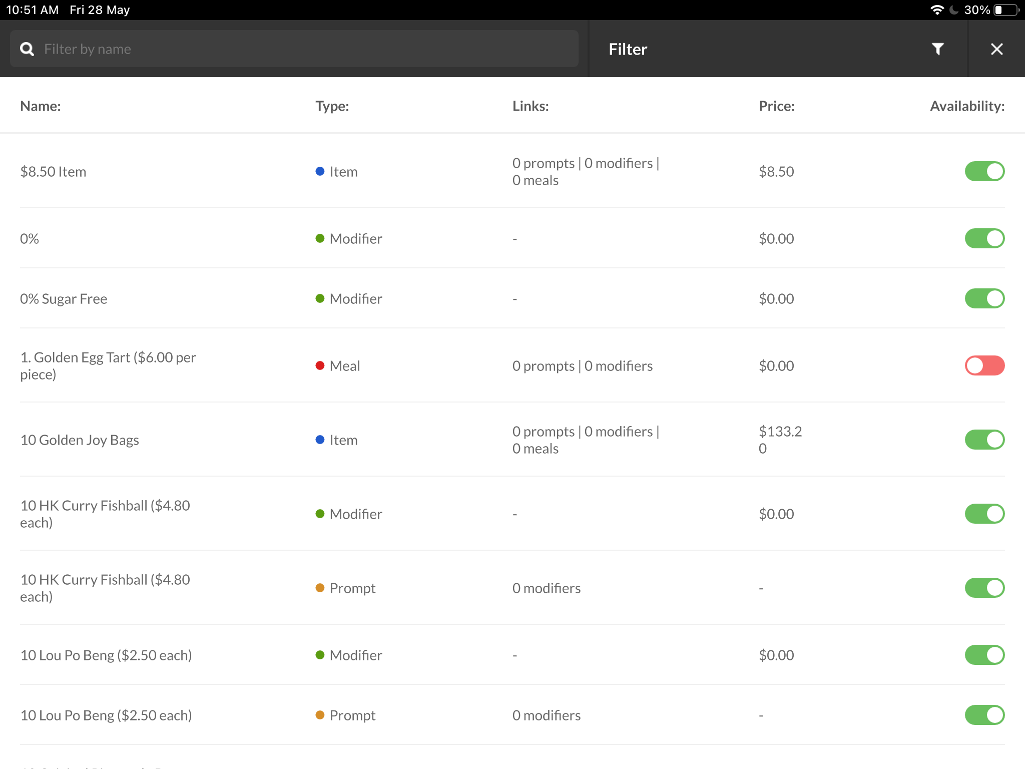Take care when toggling the availability of prompts/modifiers and meals as they may be shared with other items on the menu.